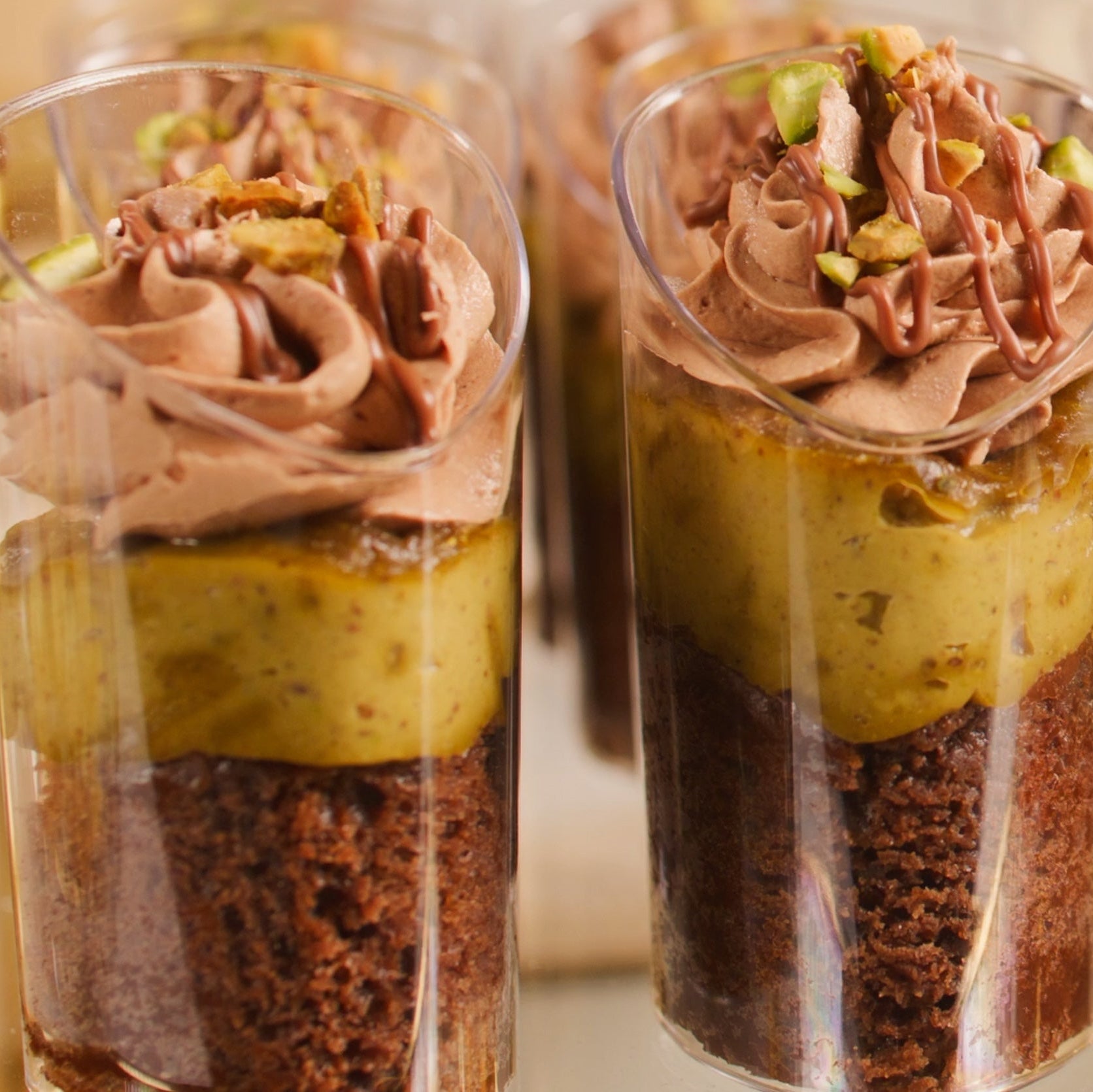 A luxurious fusion of deep chocolate and pistachio, inspired by the bold flavors of Dubai. Layers of chocolate sponge cake and pistachio cream mixed with crispy kataifi are topped with whipped chocolate ganache, a milk chocolate drizzle, and crushed pistachios. Dark, dreamy, and dazzling just like the city that inspired it.